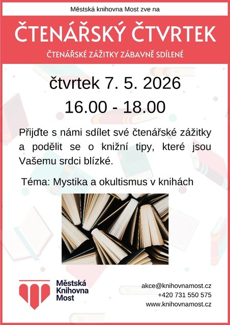 Potom jsou právě Vám určeny pravidelné Čtenářské čtvrtky v mostecké knihovně – vždy jeden čtvrtek v měsíci věnujeme prostor rozhovorům nad knihami.