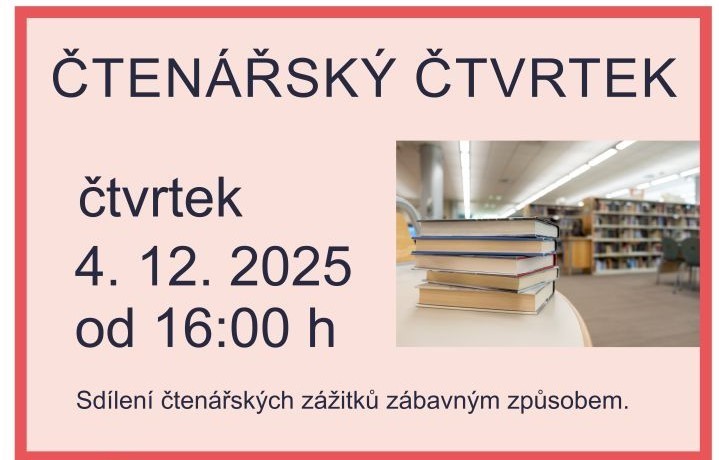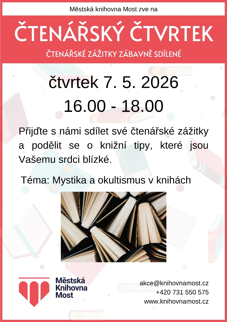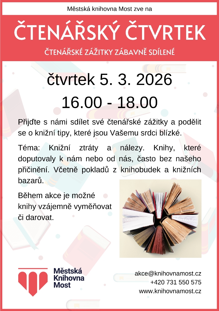 Potom jsou právě Vám určeny pravidelné Čtenářské čtvrtky v mostecké knihovně – vždy jeden čtvrtek v měsíci od 16:00 věnujeme prostor rozhovorům nad knihami.